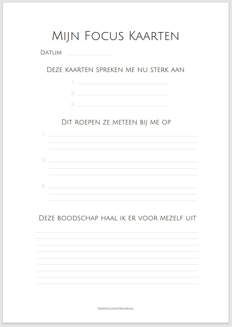 Deze printable heb ik gemaakt om je te verdiepen in de kaarten die je direct aanspreken, wanneer je door je deck heen gaat. Deze kaarten zeggen iets over processen die op dat moment belangrijk voor je zijn. Ze spreken iets in je onderbewuste aan dat erkend wil worden. Door aantekeningen bij deze kaarten te maken, kom je mogelijk tot interessante inzichten en kun je e.e.a. beter in perspectief plaatsen.