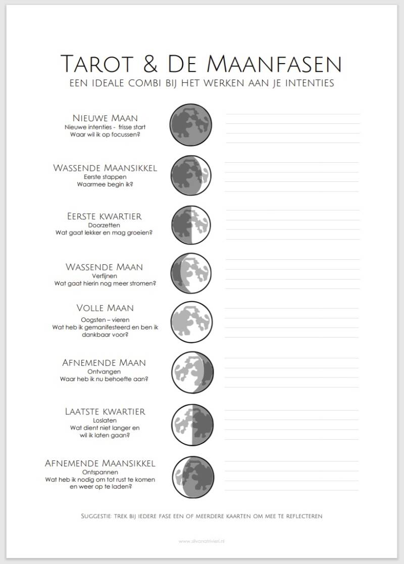 Mijn advies bij deze PDF: Schrijf in korte heldere bewoording jouw inzichten per maanfasen op. Hoe concreter, hoe beter! Je kunt bij iedere maanfase één of meerdere Tarotkaarten trekken om je te helpen tot helder inzicht te komen en om dieper mee te reflecteren. Eventueel kun je daar in een journal of notitieboekje verder over schrijven.